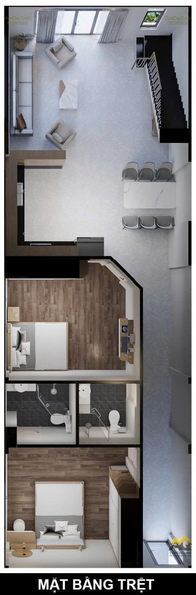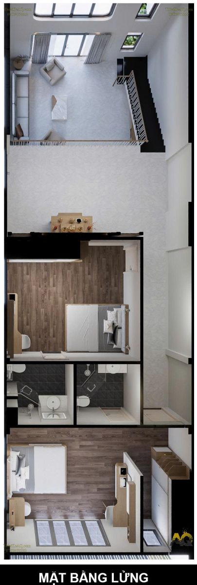 - Tối ưu hóa chức năng gia đình: Tầng trệt có thể bao gồm 1 phòng ngủ chính, phòng khách lớn, bếp và khu vực ăn uống. Gác lửng có thể bổ sung 1-2 phòng ngủ phụ, hoặc khu vực sinh hoạt chung thứ cấp.