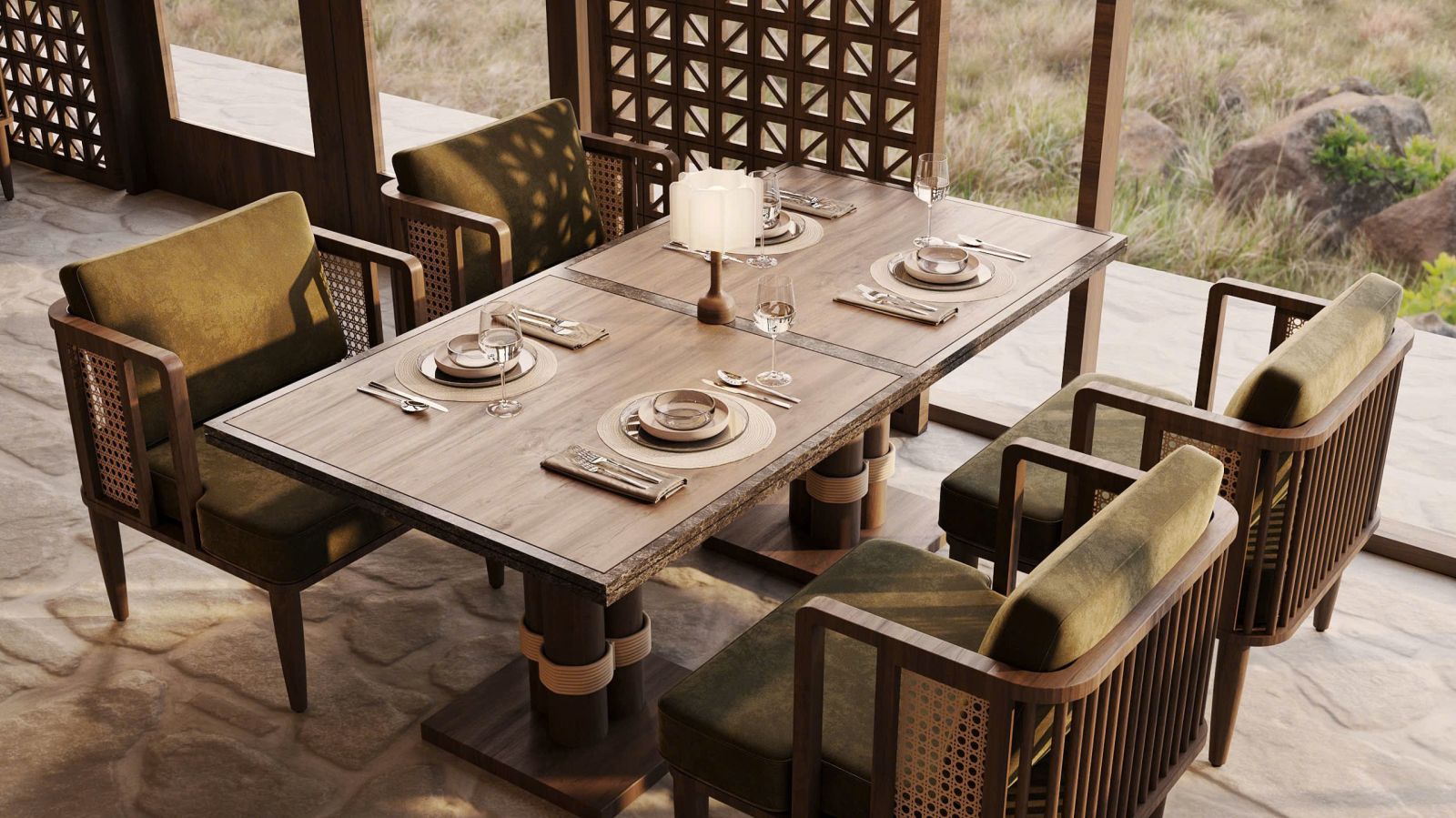 - Bàn ăn gỗ kết hợp với ghế ăn bọc da hoặc nệm